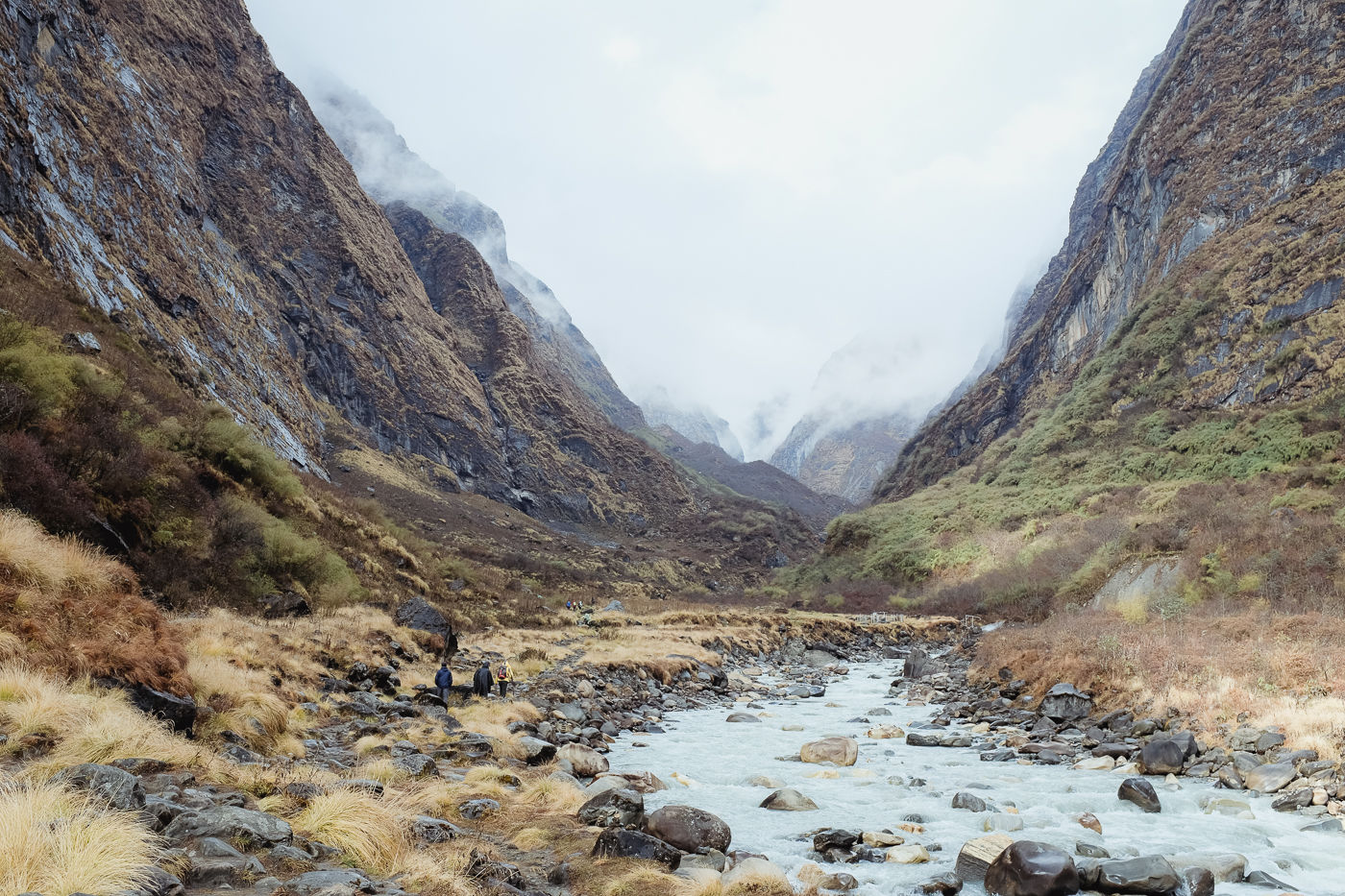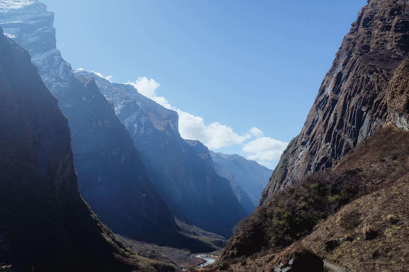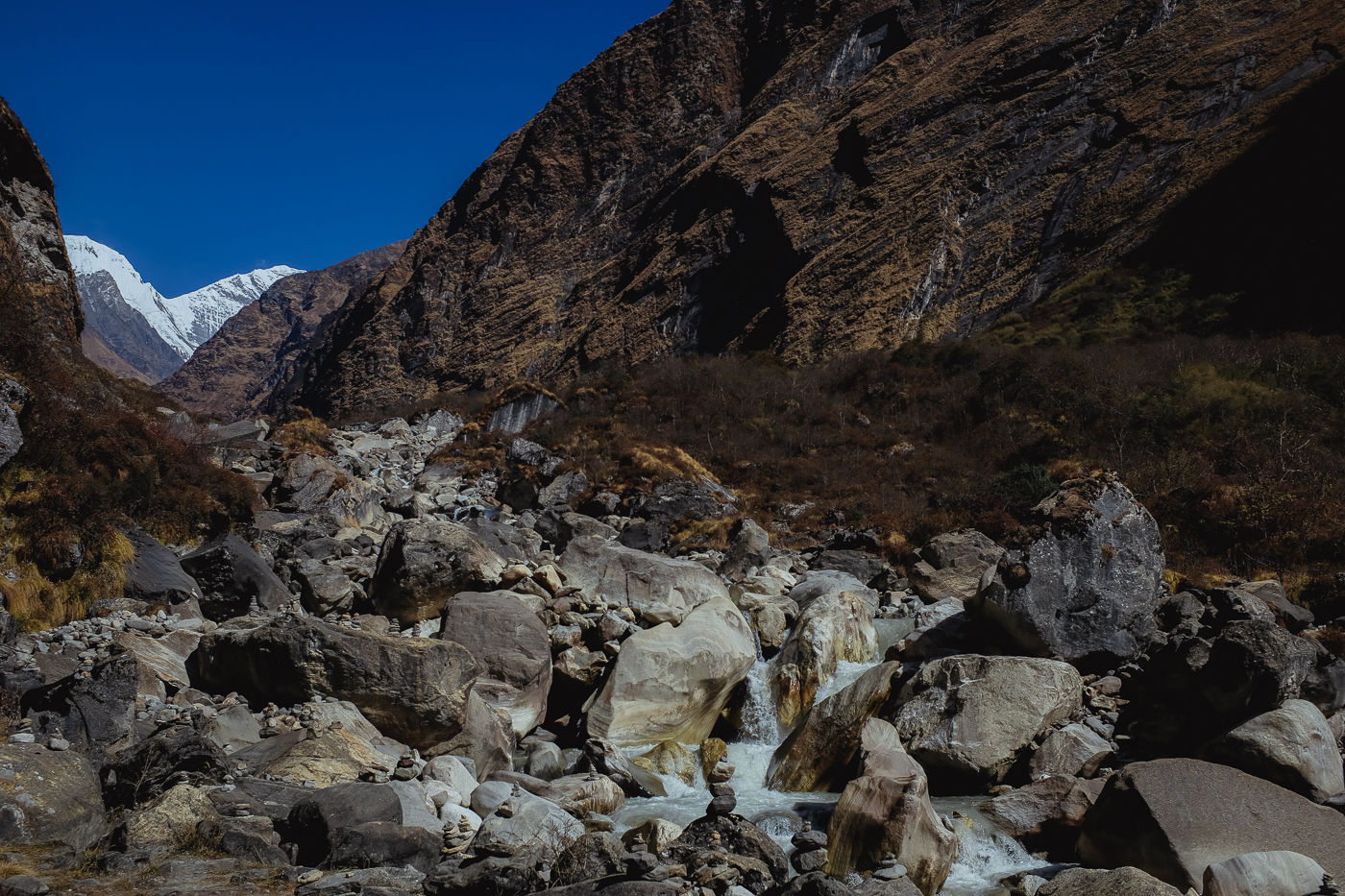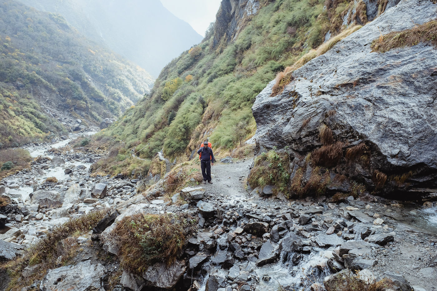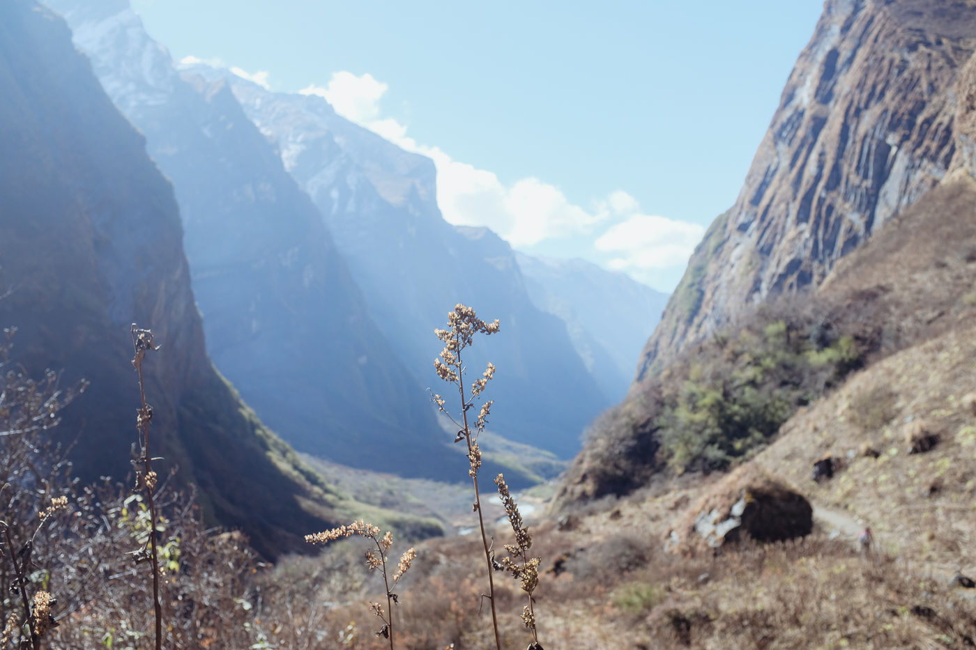 Small flowering plants adorn the trail with their colors. Mostly white and reddish brown. The mountains on either side are rocky and gigantic. Small waterfalls flow from either side into Modi Khola.