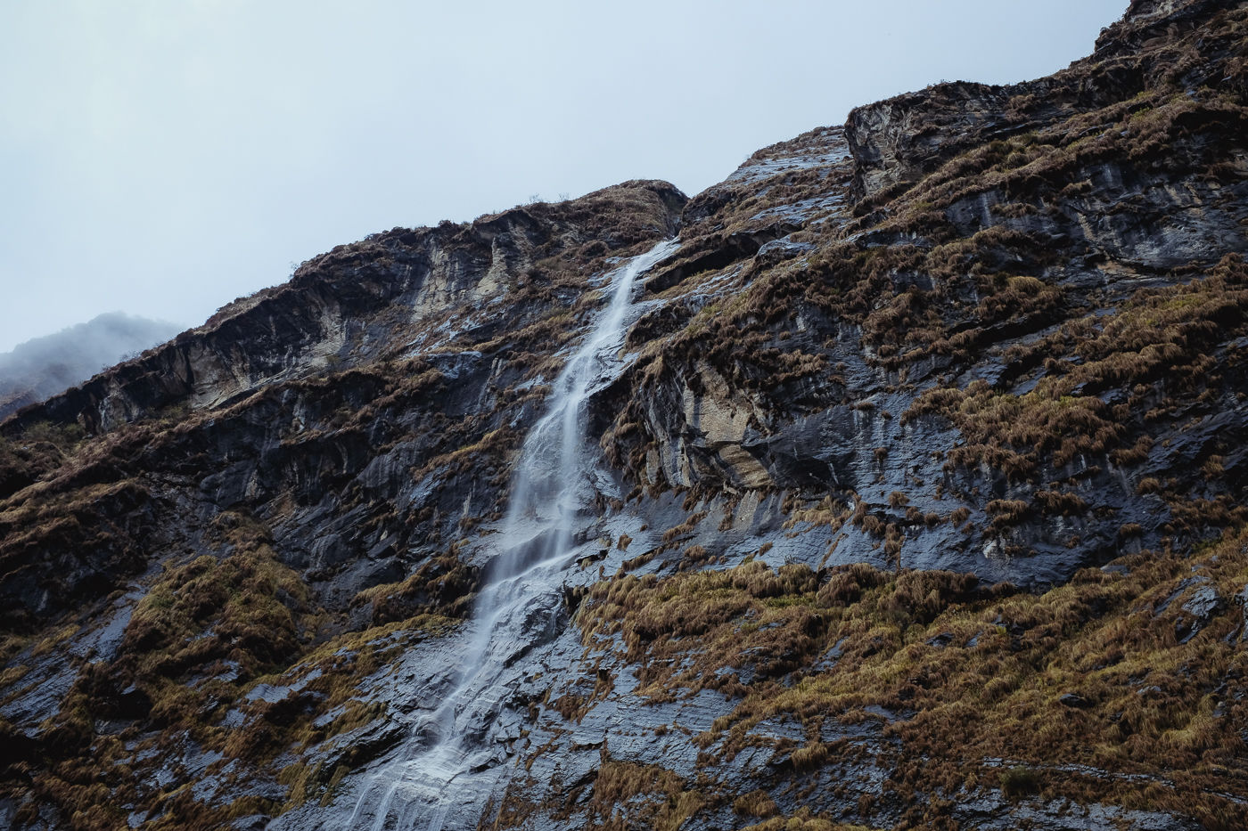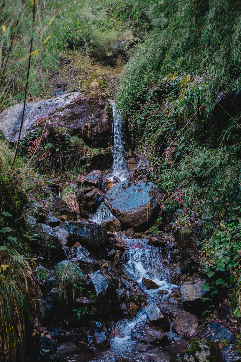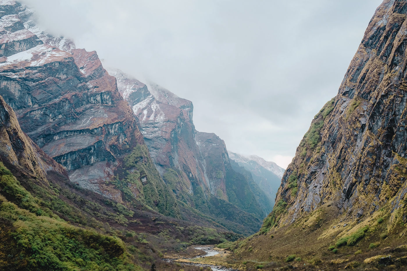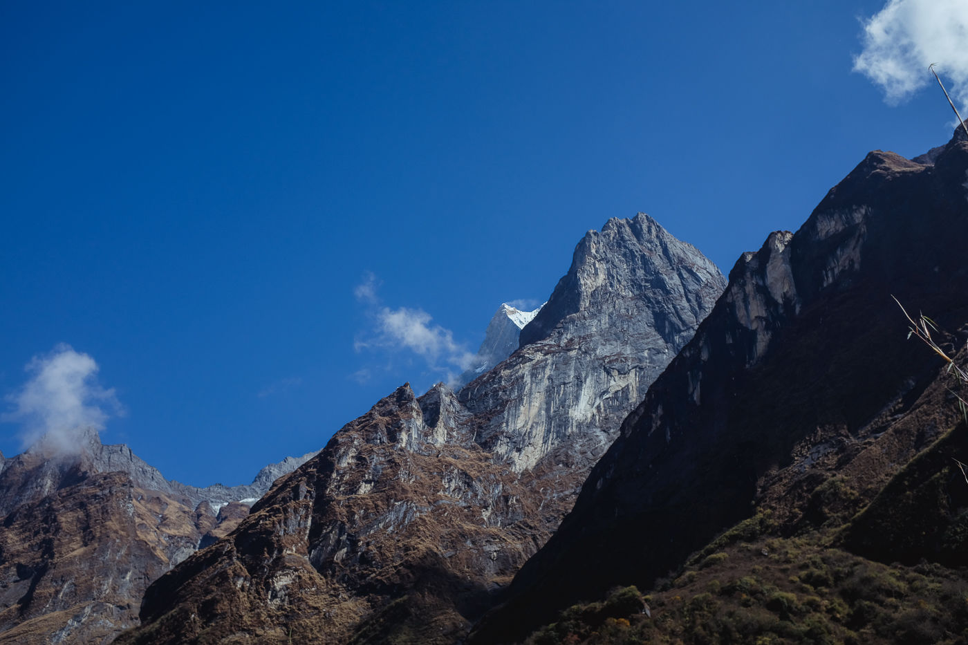 Small flowering plants adorn the trail with their colors. Mostly white and reddish brown. The mountains on either side are rocky and gigantic. Small waterfalls flow from either side into Modi Khola.