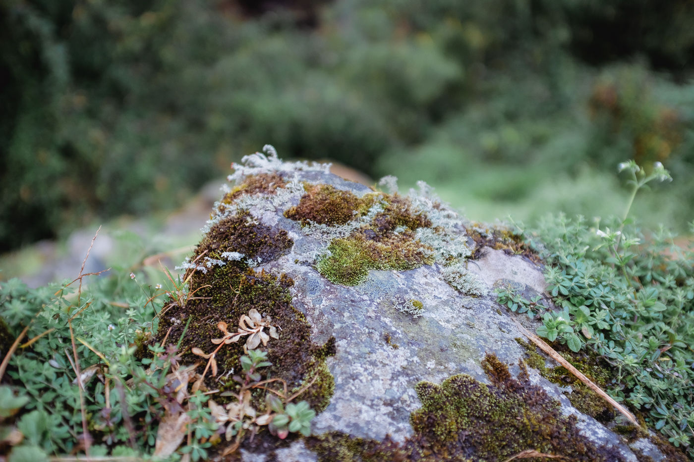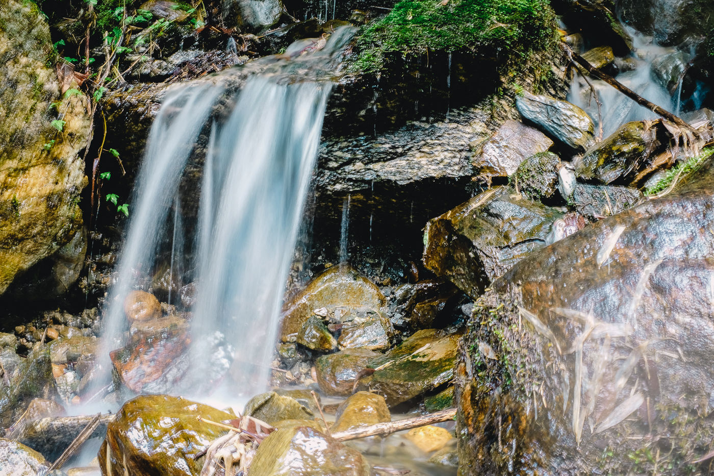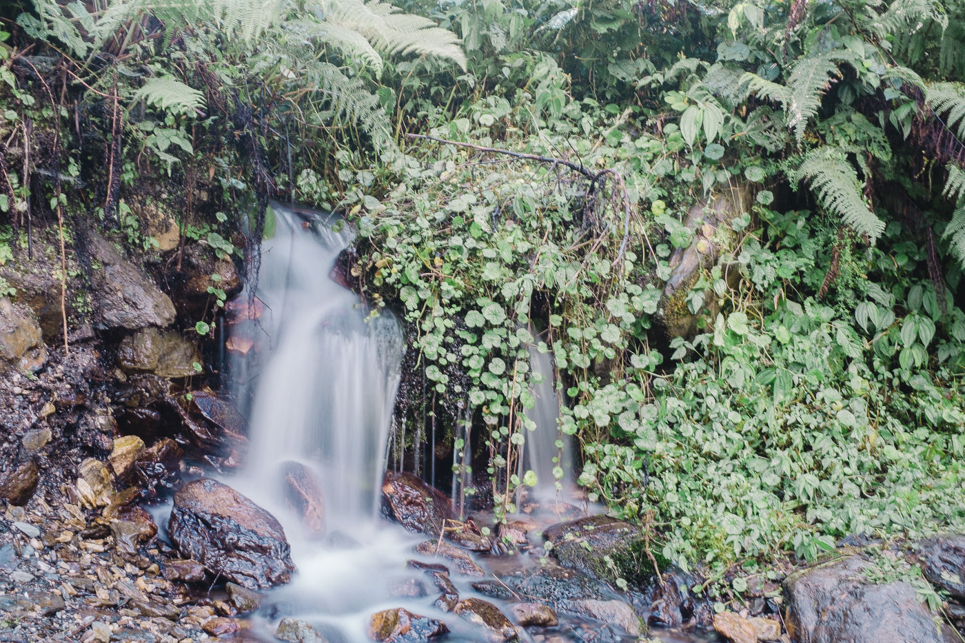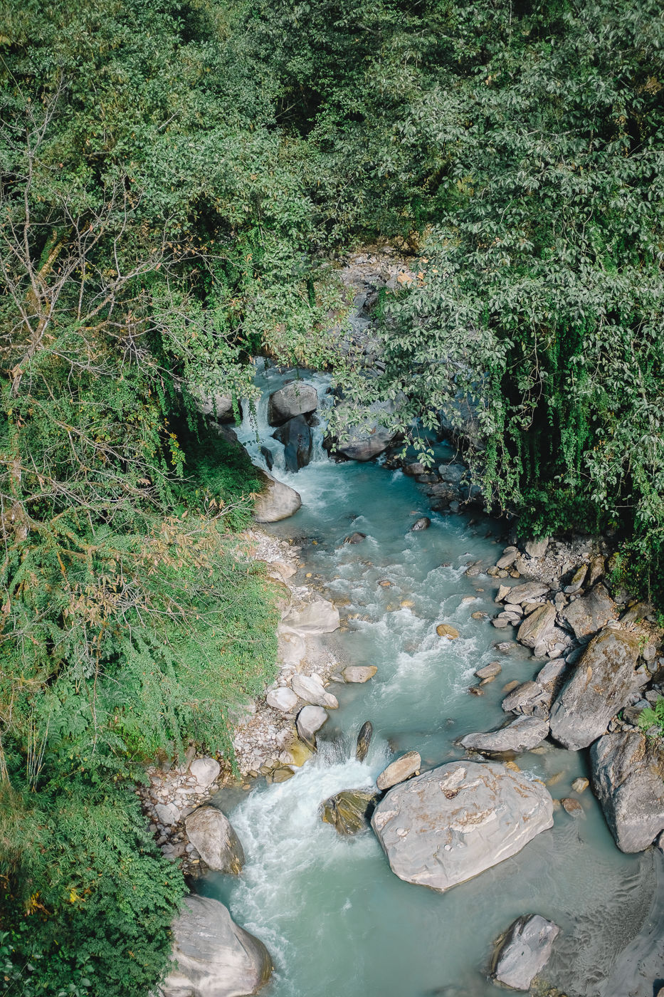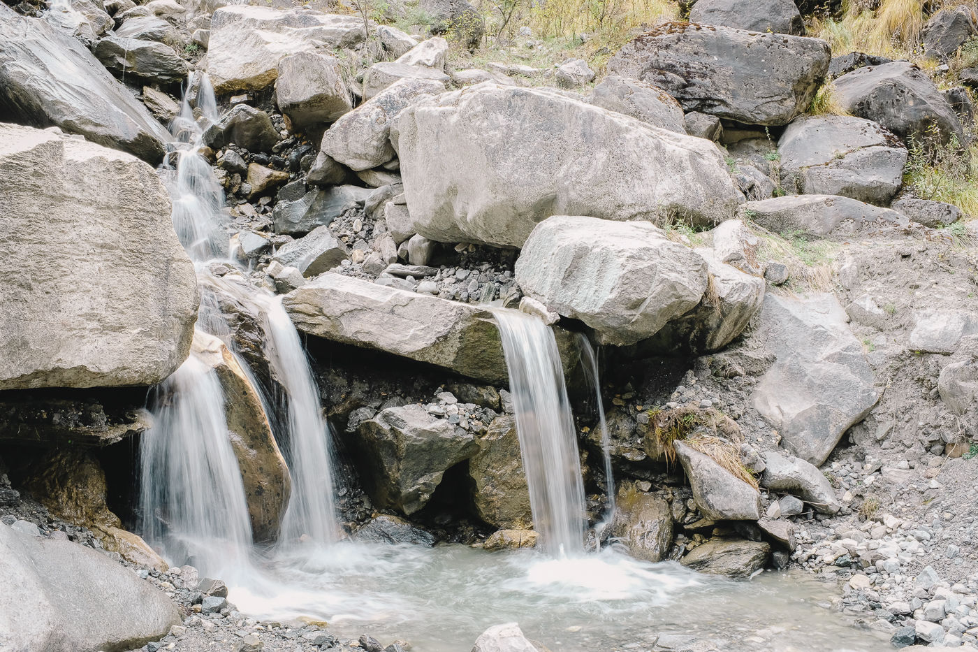 Small flowering plants adorn the trail with their colors. Mostly white and reddish brown. The mountains on either side are rocky and gigantic. Small waterfalls flow from either side into Modi Khola.