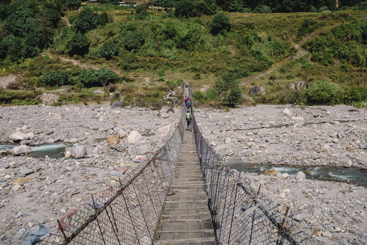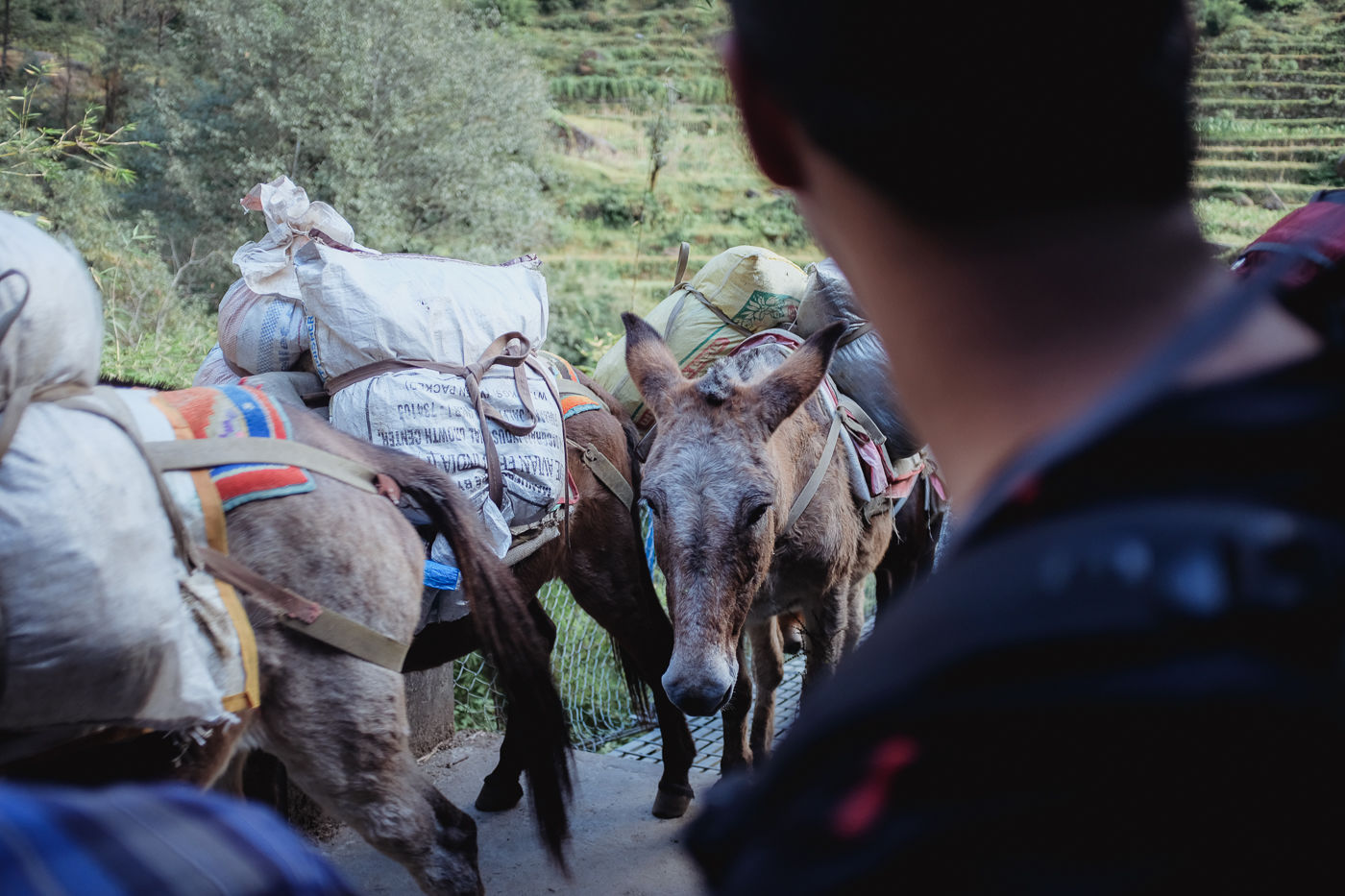 Today we set out for Dovan. The trail goes through make shift bridges. Iron bridges. Mules on bridges.
